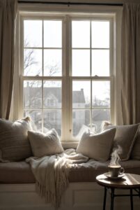 Window seats are a perfect way to combine comfort and style. Create a cushioned window nook with plenty of pillows and blankets, offering a peaceful spot to relax with a book. Add a small side table with a cup of tea or coffee for a cozy touch.