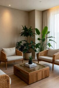 Incorporating natural elements into your living room can enhance the feeling of warmth. Wooden furniture, plants, and natural stone accents create a grounding effect. Consider adding a reclaimed wood coffee table, a few potted plants, or a woven rattan chair. These organic materials not only add texture but also bring the tranquility of nature into your living space.