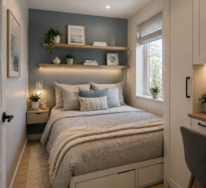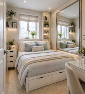 This solution helps maintain a tidy bedroom without adding bulky furniture. It’s one of the easiest ways to make a small bedroom more functional.