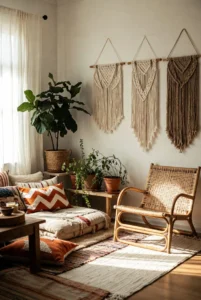 Decor elements such as macrame wall art, patterned cushions, and indoor plants give the room personality and charm. Mixing textures and colors creates a layered look that feels effortlessly stylish.