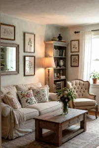 Cottage-style living rooms focus on comfort, warmth, and timeless charm. Soft pastel colors such as light blue, cream, and sage green create a peaceful and inviting atmosphere.