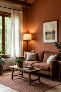 Earth tones such as brown, terracotta, olive green, and beige create a warm and grounded living room environment.
