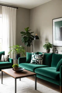 Green accents bring freshness and vibrancy to a living room design. An emerald green sofa or green decorative pillows can instantly become the focal point of the space. Neutral walls help highlight the color while keeping the room balanced.