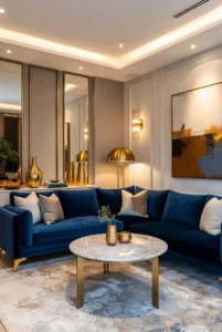 Neutral color palettes keep the room balanced while allowing the materials to stand out. Decorative sculptures, modern artwork, and stylish lamps add refinement. This living room idea is perfect for homeowners who want a glamorous yet modern interior.