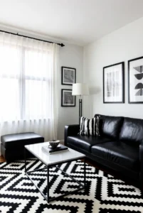 A monochrome living room creates a bold and elegant visual impact. Using a black and white color palette allows furniture and decor pieces to stand out while maintaining a sleek modern appearance.