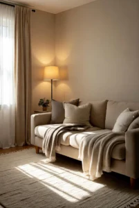 Adding light wooden furniture and soft fabrics enhances the cozy feel of the room. Decorative pillows, textured rugs, and subtle wall art help complete the aesthetic without overwhelming the design.