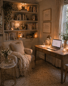 Soft lighting plays an important role in creating a relaxing workspace atmosphere. Desk lamps, fairy lights, and warm bulbs provide gentle illumination that reduces harsh shadows. Layered lighting allows the office to feel comfortable while still providing enough brightness for work tasks.