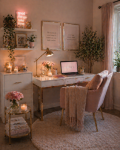 These subtle metallic touches reflect light and add warmth to the workspace. Combining gold decor with soft fabrics and gentle lighting helps maintain a cozy environment. The result is a workspace that feels refined and inspiring without appearing overly formal. Gold accents can transform even simple desks into stylish focal points.