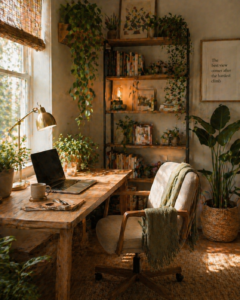 Natural light plays an important role in this type of workspace. Positioning the desk near a window allows sunlight to enhance the warm tones of wood and greenery. Simple decor such as woven baskets or stone accessories complements the natural theme. A nature-inspired office encourages focus and relaxation while maintaining a cozy and inviting atmosphere.