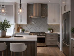 Using light gray tones keeps the pattern subtle and refined. Paired with white cabinets or marble countertops, the chevron backsplash becomes a stylish focal point. This design choice offers visual excitement while preserving the calm and sophisticated atmosphere of neutral kitchens.