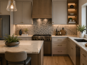 Stone tiles also introduce natural variation in color and pattern. These details prevent the backsplash from feeling flat or plain. Paired with warm lighting and neutral cabinetry, matte stone tiles enhance the kitchen’s elegant atmosphere.